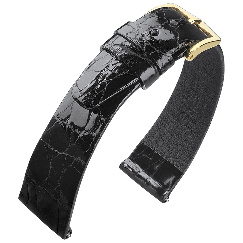 Hirsch Prestige Uhrenarmband Glänzendes Krokodilleder Schwarz
