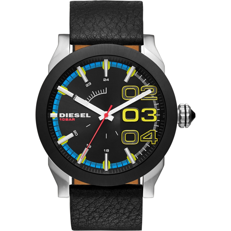 Dieses Uhrenarmband wird aus schwarzem Leder gefertigt und kommt an einer original Diesel Stahlschliesse.