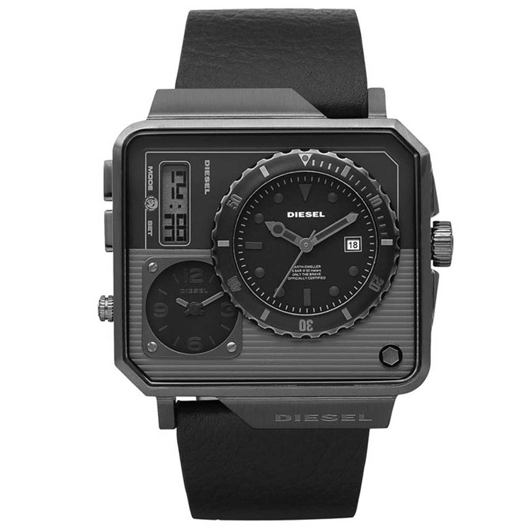 Dieses Uhrenarmband wird aus schwarzem Leder gefertigt und kommt an einer original Diesel Stahlschliesse.