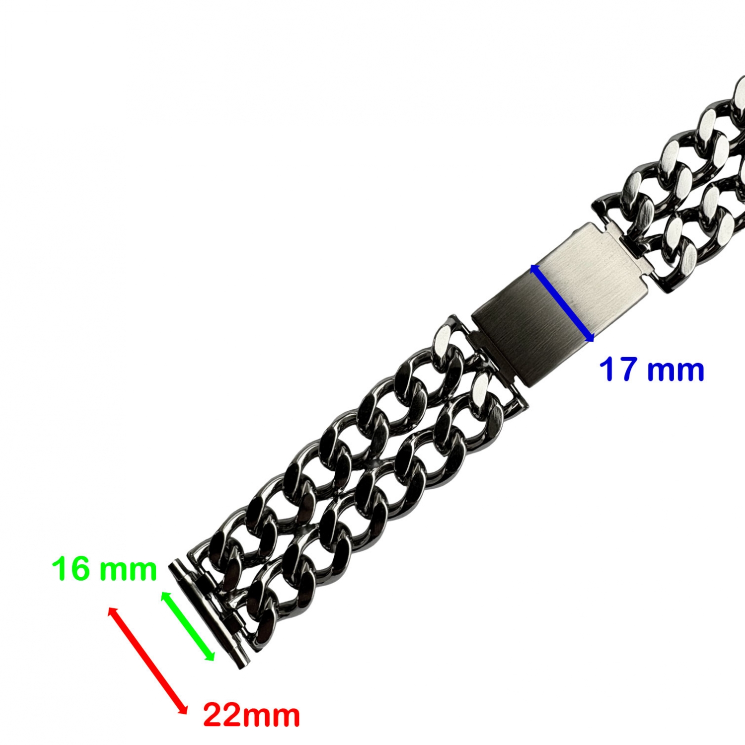 Die Enden sind gefedert und können von 22mm bis zu 16mm eingedrückt werden, wodurch das Uhrenarmband an Uhren mit einer Ansatzbreite von 16 bis 22mm passt. Wir empfehlen das Band nicht zu kaufen, wenn Ihr Pulsumfang grösser ist als 20 cm.