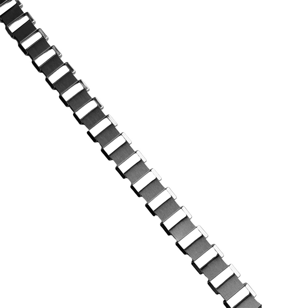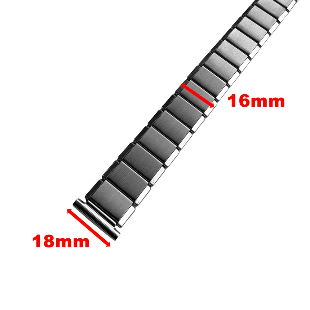Dieses Uhrenarmband ist ein Zugband - die Glieder (die einzeln entfernt werden können um das Band bei Bedarf einzukürzen) dehnen sich beim An- und Ausziehen der Uhr. Jedes Glied ist 8mm breit, das Band ist nach Wahl mit 18 oder 19 Gliedern erhältich (mit einer Gesamtlänge - ohne Dehnung - von 15,5 oder 16.3 cm.