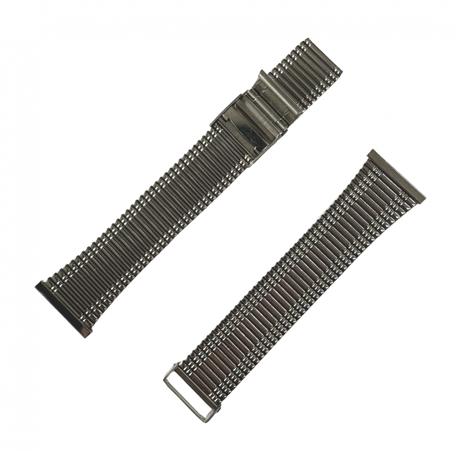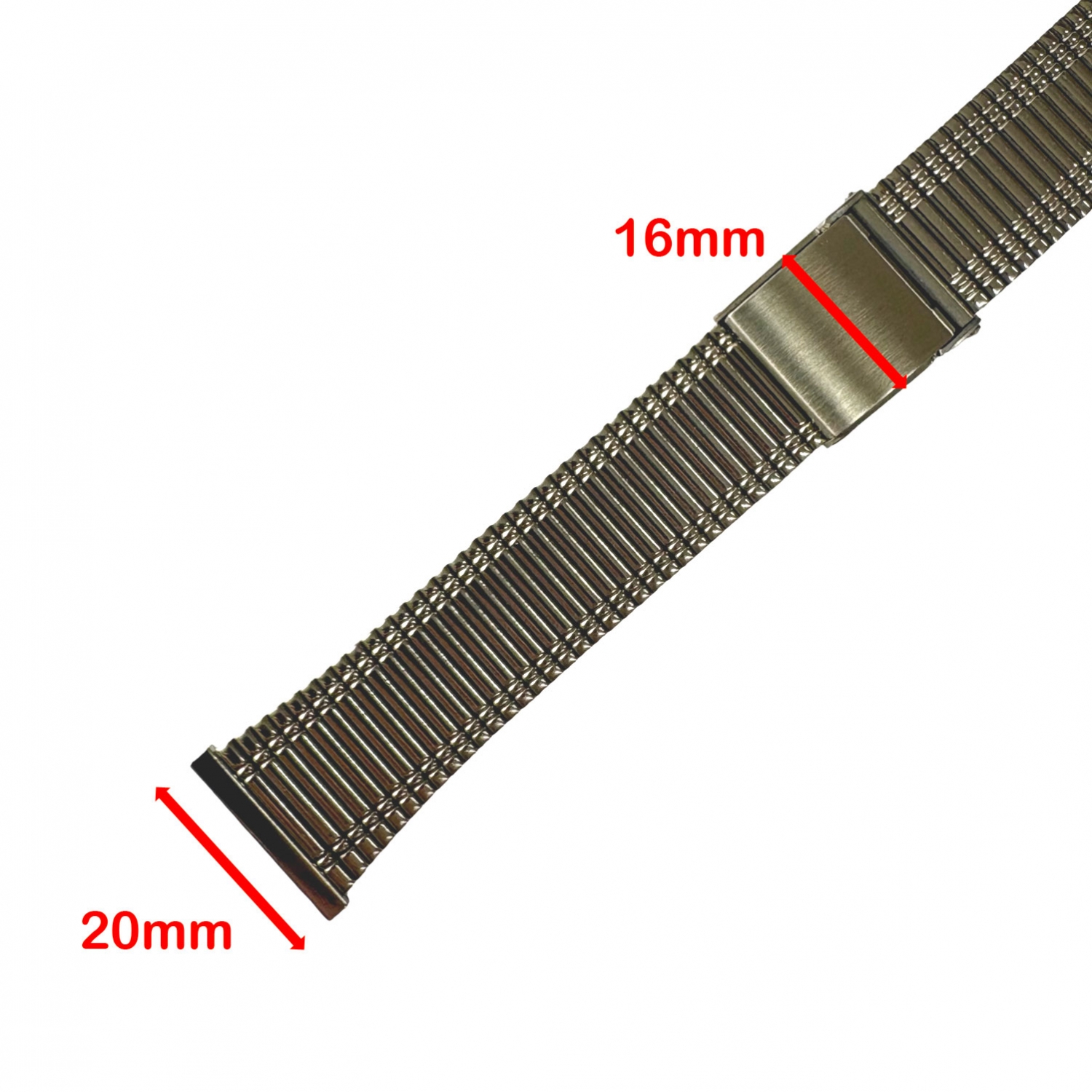 Dieses Uhrenarmband hat eine verschiebbare Schliesse, mit der das Band milimeterweise abgestellt werden kann. Das Uhrenarmband ist am Uhrenansatz 20mm breit und bei der Schliesse 16mm. Wie in den 70er Jahren üblich, kann der Ansatz mit einer Feile schmaler gemacht werden, wodurch das Band auch für Uhren mit einem 18 oder 19mm breitem Ansatz geeignet ist. Wir empfehlen das Band nicht zu kaufen, wenn Ihr Pulsumfang grösser ist als 20cm.