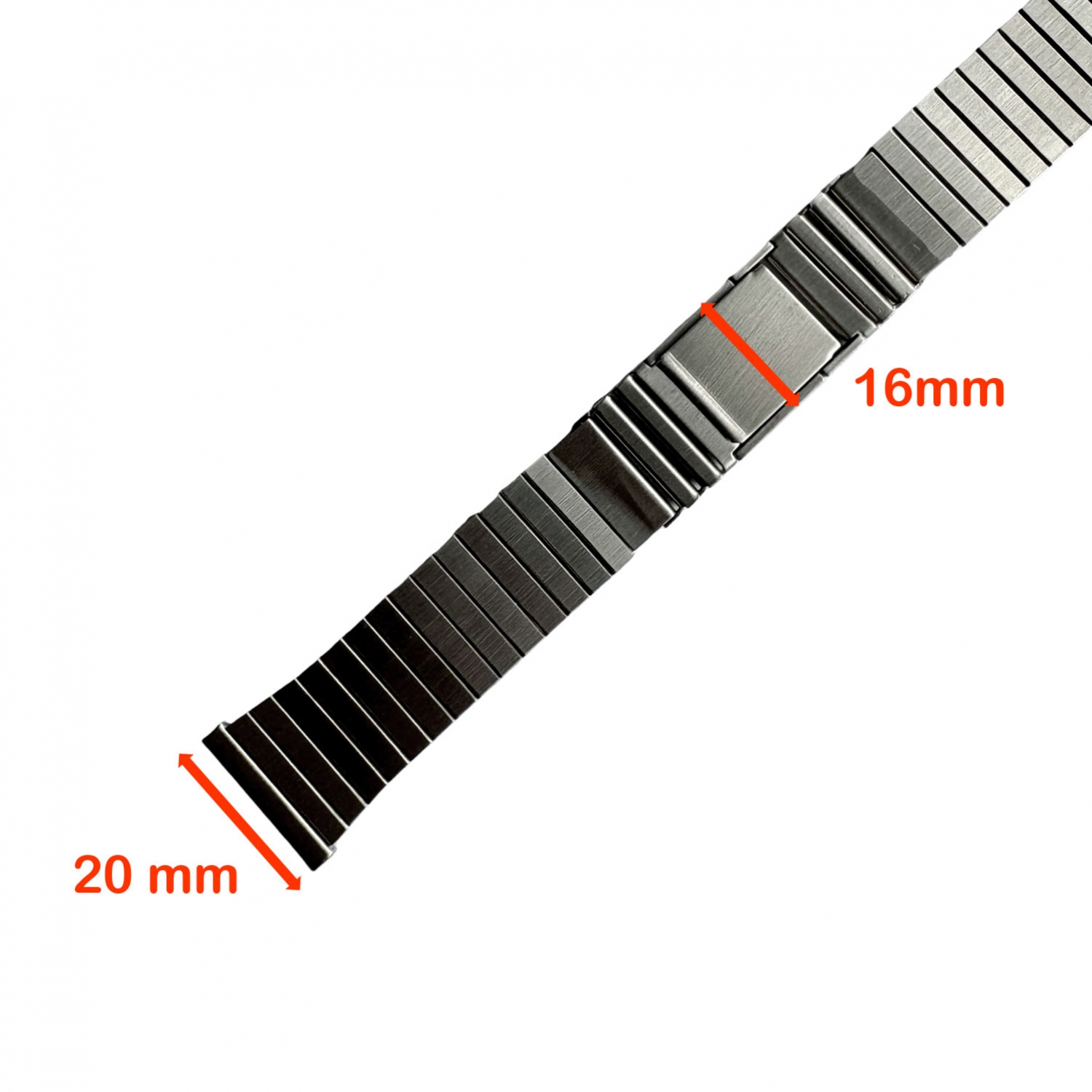 Das Uhrenarmband ist am Uhrenansatz 20mm breit und bei der Schliesse 16mm. Wie in den 70er Jahren üblich, kann der Ansatz mit einer Feile schmaler gemacht werden, wodurch das Band auch für Uhren mit einem 18 oder 19mm breitem Ansatz geeignet ist. Wir empfehlen das Band nicht zu kaufen, wenn Ihr Pulsumfang grösser ist als 18 cm.
